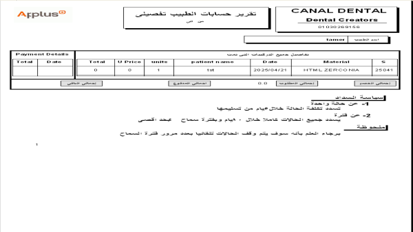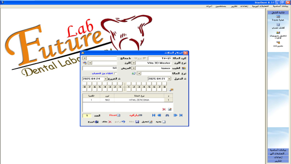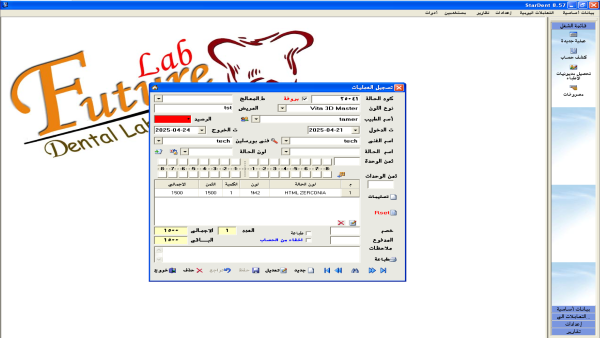 يستخدم البرنامج فى ادراة معامل الاسنان (عادى/ اكريل)محاسبيا حيث يمكنك من تسجيل عمليات الشغل الواردة من الاطباء كما يمكنك من تسجيل ارصدة مديونيات سابقة للاطباء دون الحاجة الى ادخالها على النظام كما يمكنك من تسجيل تسديد الاطباء لدفعات نقدية مما يمكنك من متابعة مديونية الاطباء وايضا يمكنك من تسجيل ارصدة الاصناف وتسجيل شرائها والمستهلك منها ويعطيك تقرير بالرصيد الحالى للاصناف كما يمكن من خلاله تسجيل الحضور والانصراف للموظفين مع عرض تقرير بمدة التاخير خلال الشهر كما يمكنك من تسجيل مستحقات الموردين ومديونيات المعمل للموردين كما يتيح تسجيل المصروفات اليومية ويومية الخزينة مع عرض تقرير يومية الخزينة من ايرادات ومصروفات المعمل كما يمكن طباعة باركود لكل حالة على حدى